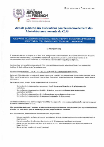 Avis de publicité aux associations pour le renouvellement des administrateurs nommés du CCAS