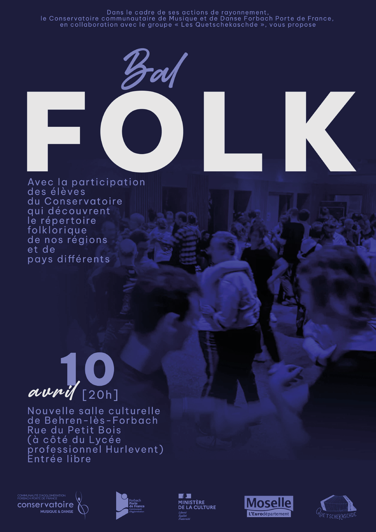 Dans le cadre de ses actions de rayonnement, le Conservatoire communautaire de Musique et de Danse Forbach Porte de France, en collaboration avec le groupe "Les Quetschekaschde" propose un Bal Folk :