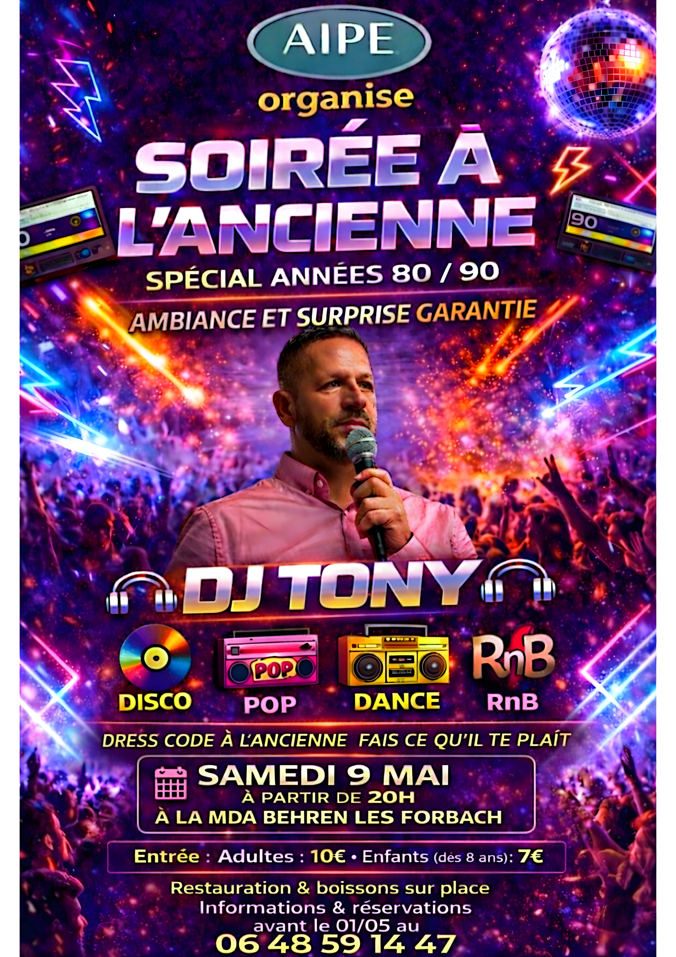 L'AIPE vous invite à une soirée rétro inoubliable ! 🎵 DJ TONY vous fera danser sur : DISCO 🎵 | POP 🎤 | DANCE 🎧 | RnB 🎶