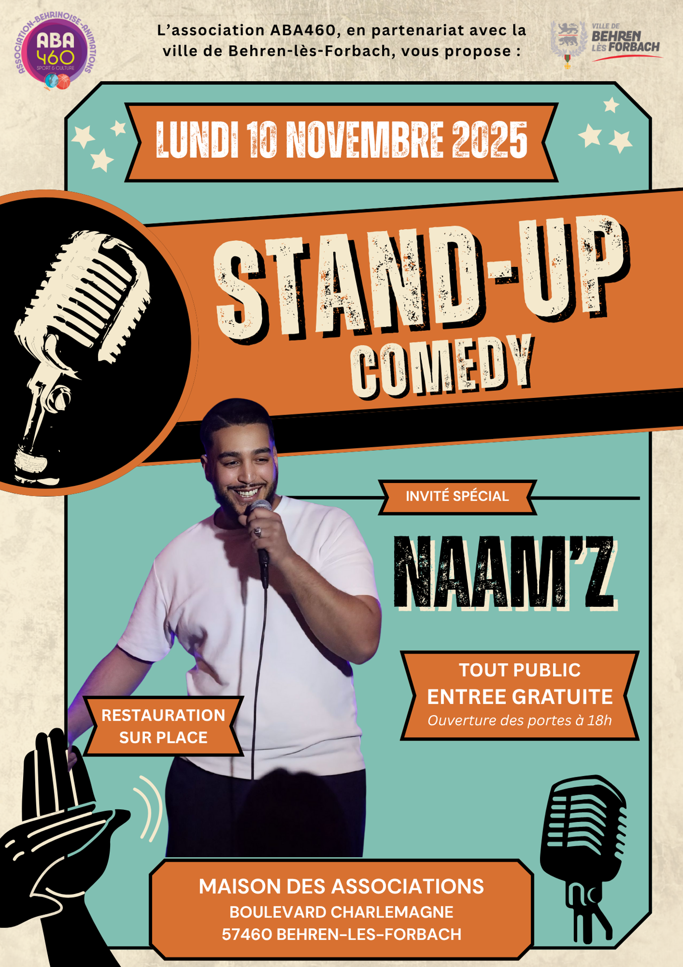 Préparez-vous à une soirée pleine de rires ! ABA460 en partenariat avec la Ville de Behren vous propose une soirée sous le signe de l'humour avec NAAM’Z :